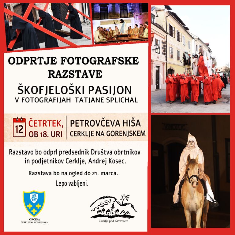 Vabljeni na odprtje fotografske razstave Škofjeloški pasijon v fotografijah Tatjane Splichal, ki bo v četrtek, 12. marca 2026, ob 18. uri v Petrovčevi hiši v Cerkljah na Gorenjskem.