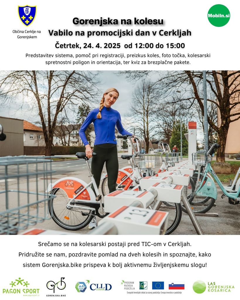 Občina Cerklje na Gorenjskem v sodelovanju s partnerji Mobiln.si, Pagon Šport in drugimi vabi občane na promocijski dan sistema izposoje koles Gorenjska.bike, ki bo potekal v četrtek, 24. aprila 2025, od 12.00 do 15.00 na kolesarski postaji pred TIC-om Cerklje.