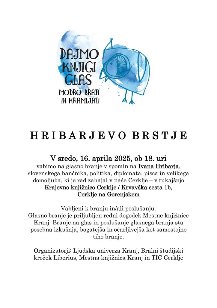 vabimo na glasno branje v spomin na Ivana Hribarja, slovenskega bančnika, politika, diplomata, pisca in velikega domoljuba, ki je rad zahajal v naše Cerklje – v tukajšnjo Krajevno knjižnico Cerklje / KrvavškA cesta 1b, Cerklje na Gorenjskem