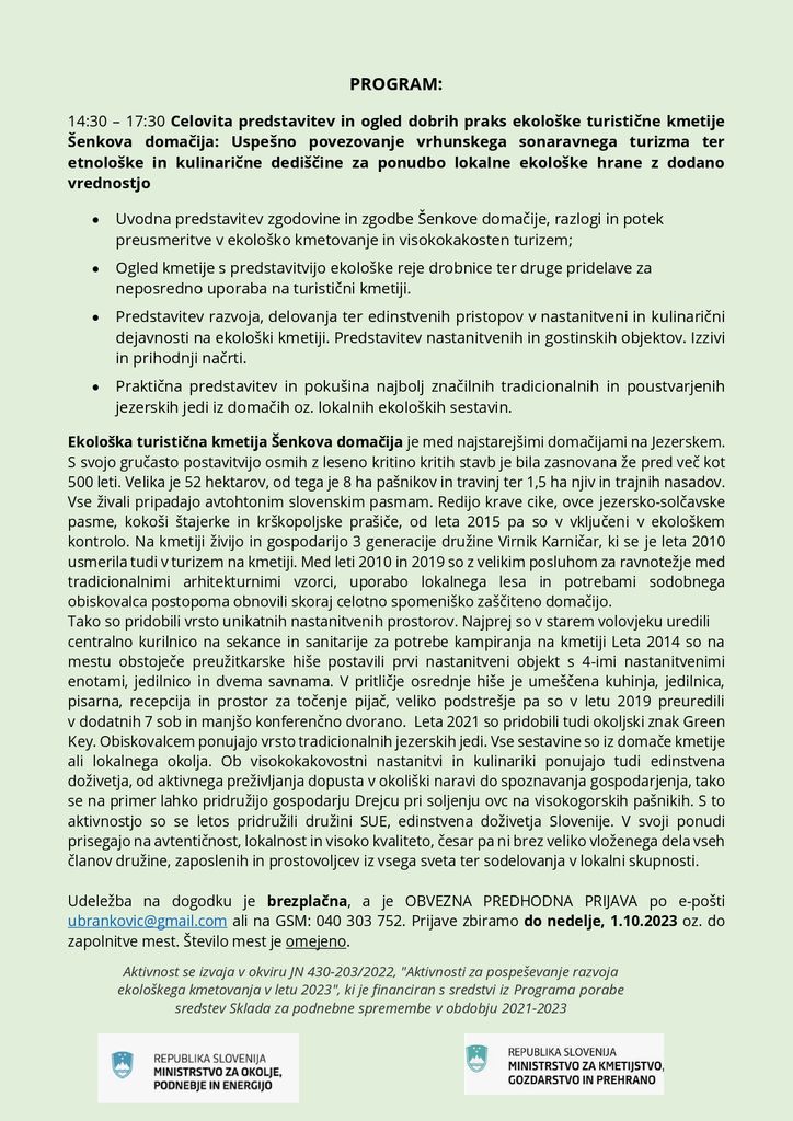 Ta bo tokrat organiziran z ogledom ekološke turistične kmetije Šenkova domačija na Zgornjem Jezerskem.