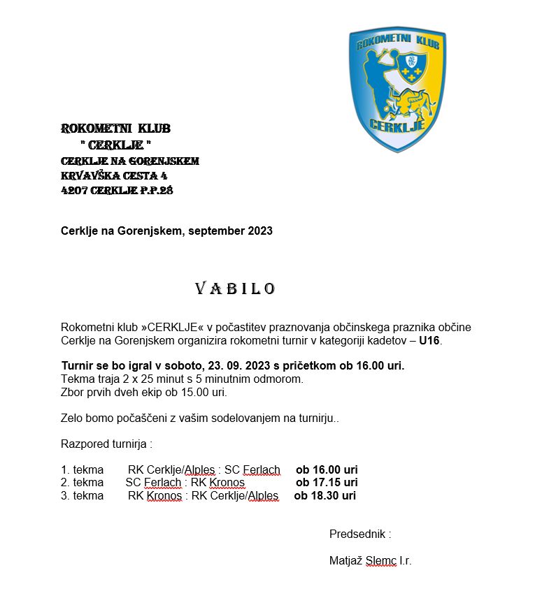 Rokometni klub Cerklje v počastitev praznovanja občinskega praznika občine Cerklje na Gorenjskem organizira rokometni turnir v kategoriji kadetov - U16