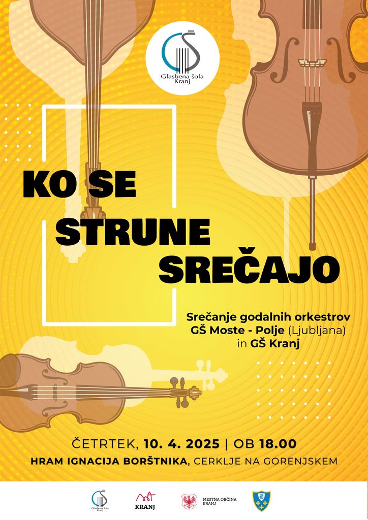 Vljudno vabljeni na koncert z naslovom ˝KO SE STRUNE SREČAJO˝, na katerem se bosta predstavila godalni orkester Glasbene šole Ljubljana Moste-Polje in godalni orkester Glasbene šole Kranj.