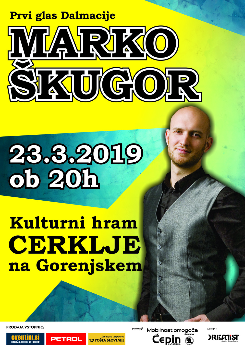 Vabljeni na Koncert Marka Škugorja, ki bo v soboto, 23. marca 2019 ob 20. uri v Kulturnem hramu Ignacija Borštnika Cerklje. Hrvaški tenorist Marko Škugor, kljub rosnim 29 letom, beleži številne uspehe in nagrade. Za največji uspeh si šteje zmago na Splitskem festivalu leta 2017, kjer je s pesmijo Ka’dica osvojil »grand prix«.