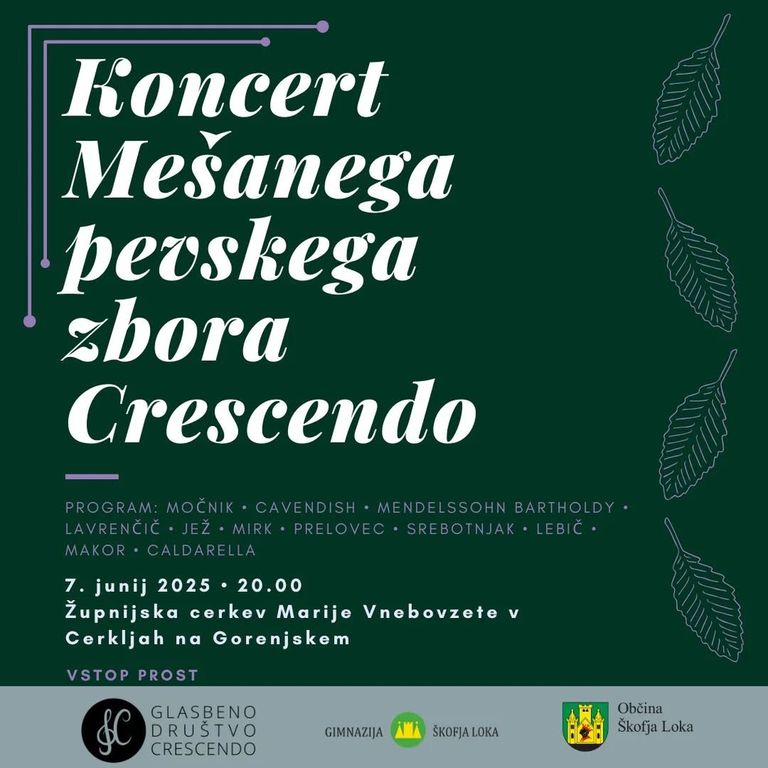 Mešani pevski zbor Crescendo se v juliju odpravlja na mednarodno zborovsko tekmovanje v Spittal an der Drau. Pred odhodom vam želimo predstaviti svoj tekmovalni program, zato vas vljudno vabimo na koncert, ki bo v soboto, 7. junija 2025, ob 20. uri v župnijski cerkvi Marije Vnebovzete v Cerkljah na Gorenjskem.