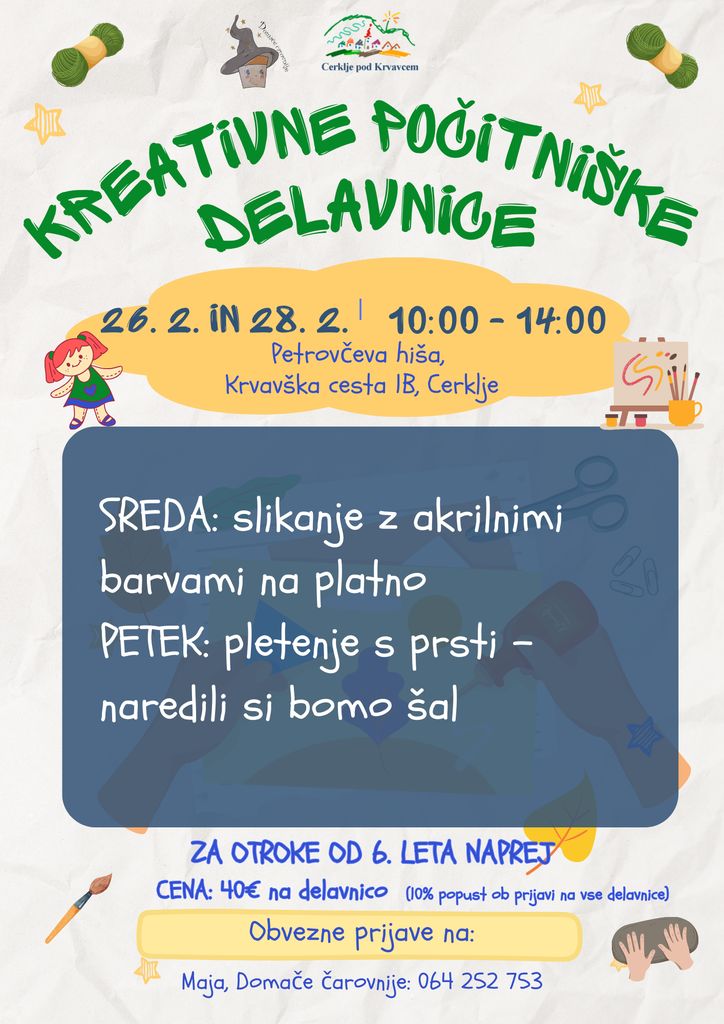 Med zimskimi počitnicami bodo v Petrovčevi hiši v Cerkljah potekale ustvarjalne delavnice za otroke, ki jih organizira Domače čarovnije v sodelovanju z TIC Cerklje. Delavnice so namenjene otrokom od 6. leta naprej in bodo potekale v sredo, 26. februarja in v petek, 28. februarja 2025 med 10.00 in 14.00.