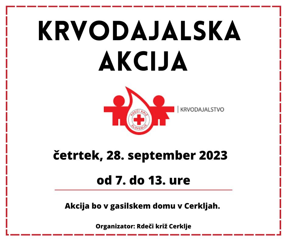 28.9. 2023, od 7:00 do 13:00, bo potekala krvodajalska akcija v gasilskem domu Cerklje.