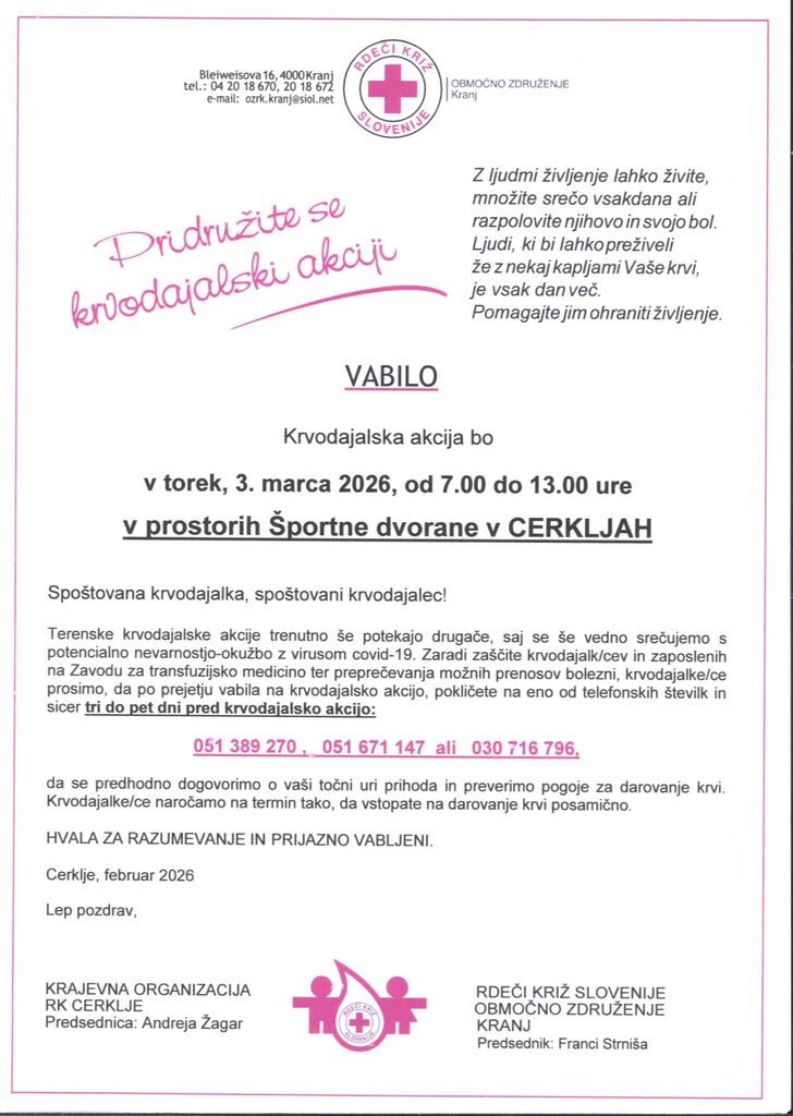 Rdeči križ Slovenije – Območno združenje Kranj in Krajevna organizacija Rdečega križa Cerklje vabita na krvodajalsko akcijo, ki bo potekala v torek, 3. marca 2026, med 7.00 in 13.00 v prostorih Športne dvorane v Cerkljah.