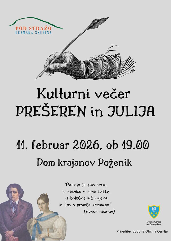 Vabljeni na kulturni večer Prešeren in Julija, ki bo posvečen slovenski poeziji, ljubezni in besedi, ki presega čas. Dramska skupina Pod Stražo bo skozi interpretacije, odrske prizore in izbrane verze obudila duh Franceta Prešerna ter njegovo večno navdihnjenje – Julijo Primic.
