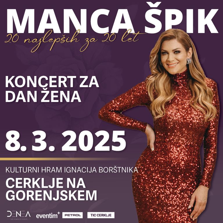 Ob praznovanju dneva žena vas vabimo na nepozaben koncert izjemne slovenske pevke Mance Špik. Z nami bo praznovala svojo bogato 20-letno glasbeno kariero s koncertom, na katerem boste lahko uživali v njenih najlepših uspešnicah.