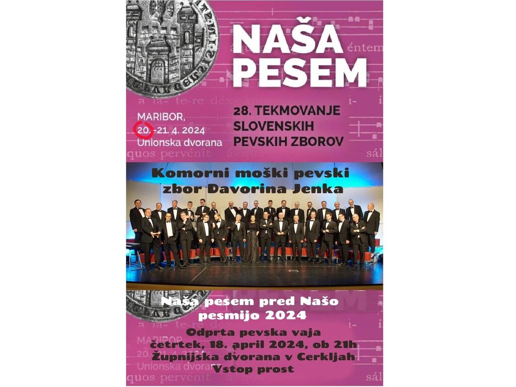 Davorinci se ponovno odpravljamo na državno zborovsko tekmovanje "Naša pesem" v Maribor. V tamkajšnji Unionski dvorani bomo nastopili v soboto, 20. aprila, ob 12.30. Še pred tem pa vas vabimo na našo odprto vajo "Naša pesem pred Našo pesmijo 2024", v četrtek, 18. aprila, ob 21h, v Župnijsko dvorano Jožefa Kvasa v Cerkljah - veseli bomo vaše spodbude!