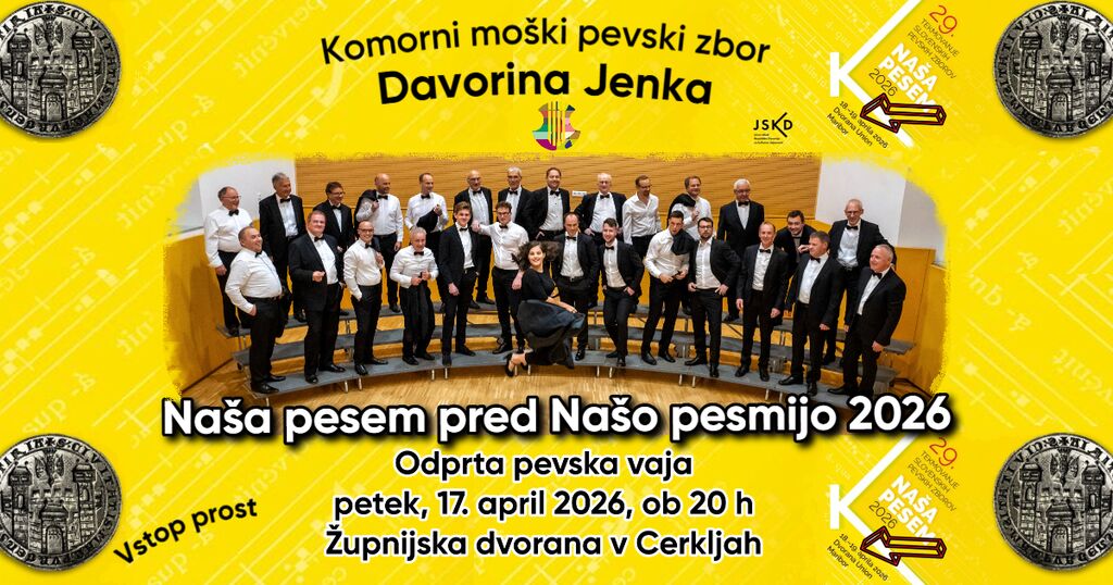 Komorni moški pevski zbor Davorina Jenka Cerklje vas vabi, da se nam pridružite na odprti pevski vaji – generalki pred državnim pevskim tekmovanjem Naša pesem 2026 v Mariboru, ki nas v tamkajšnji Dvorani Union čaka v nedeljo, 19. aprila 2026, ob 17.30.