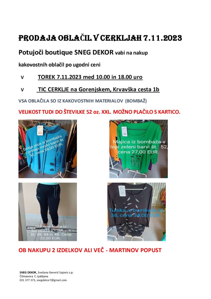 Potujoča trgovina z oblačili, Sneg Dekor, se bo tokrat oglasila pri nas, v Cerkljah na Gorenjskem, v torek 7. 11. 2023 od 10. do 18. ure v Galeriji Petrovčeve hiše.