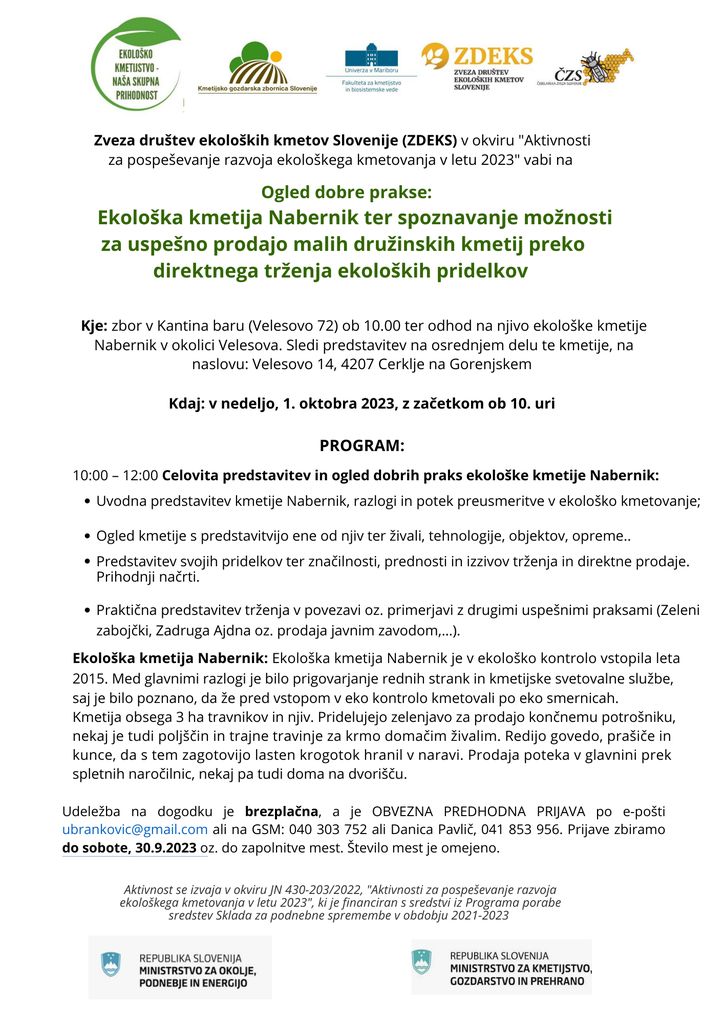V NEDELJO, 1. OKTOBRA, z zborom ob 10. uri pred barom KANTINA, Velesovo 72. Sledi predstavitev na osrednjem delu Ekološke kmetije Nabernik, Velesovo 14 v Cerkljah.