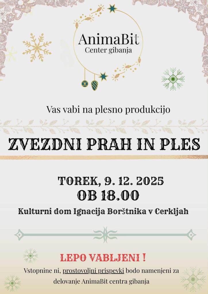 AnimaBit Center gibanja vabi na plesno produkcijo z naslovom Zvezdni prah in ples, ki bo v torek, 9. decembra 2025, ob 18.00 v Kulturnem domu Ignacija Borštnika v Cerkljah.