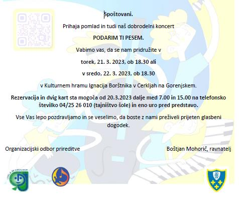 Osnovna šola Davorina Jenka Cerklje vas vljudno vabi na pomladni dobrodelni koncert PODARIM TI PESEM 2023.