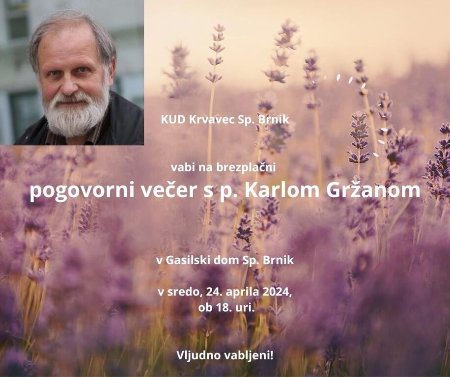 KUD Krvavec Sp. Brnikvabi na brezplačni pogovorni večer s p. Karlom Gržanom v Gasilski dom Sp. Brnik 24. aprila 2024 ob 18. uri.