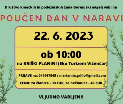 NA POUČEN DA V NARAVI 22. 6. 2023, S PRIČETKOM 0B 10. URI NA KRIŠKI PLANINI (Eko Turizem Viženčar).