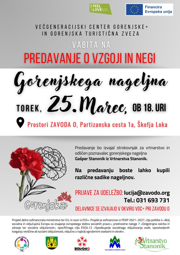 Večgeneracijski center Gorenjske+ in Gorenjska turistična zveza vabita na predavanje o vzgoji in negi gorenjskega nageljna, ki bo potekalo v torek, 25. marca, ob 18. uri v prostorih Zavoda O (Partizanska cesta 1a, Škofja Loka).