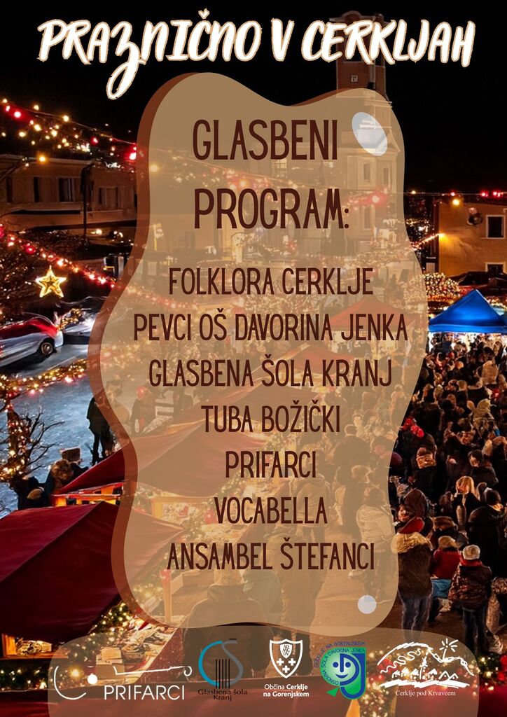 Dogodek bo otvoril adventni sejem z lokalnimi ustvarjalci, sledil pa bo bogat glasbeni program na zunanjem odru. Božično-novoletne melodije bodo pričarali Folklora Cerklje, pevci OŠ Davorina Jenka, Glasbena šola Kranj, Tuba Božički, Prifarci, Vocabella in Ansambel Štefanci.