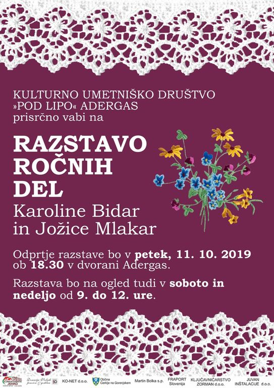 V petek, 11. oktobra 2019, vas ob 18.30. uri prisrčno vabimo na odprtje razstave ročnih del ustvarjalk Karoline Bidar in Jožice Mlakar. Razstava bo na ogled v kulturni dvorani v Adergasu še v soboto in nedeljo od 9. do 12. ure. Vstopnine ni.