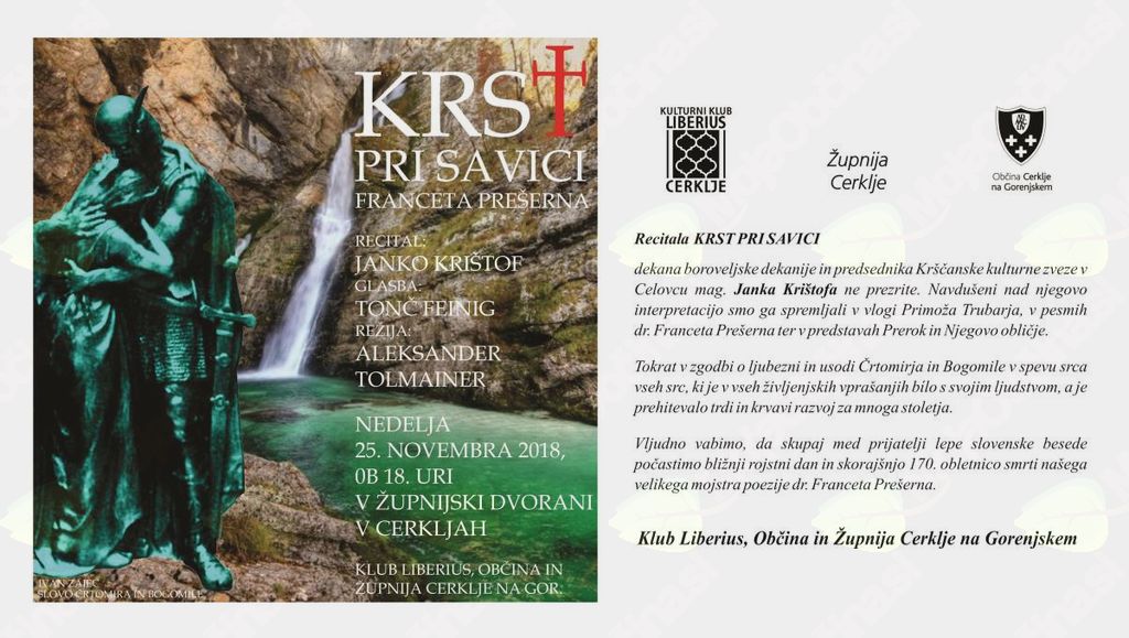 Vabljeni na Recital Janka Krištofa - Krst pri Savici, v nedeljo, 25. novembra 2018 ob 18. uri, v župnijski dvorani v Cerkljah.