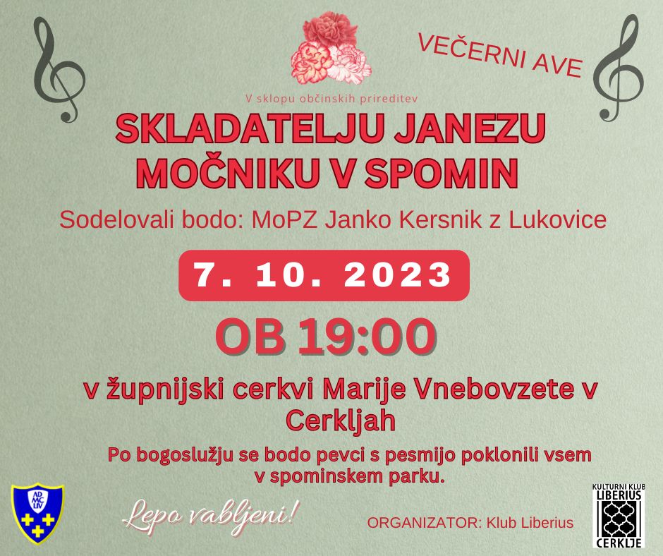 MoPZ JANKO KERSNIK z Lukovice bo v soboto, 7. oktobra, pri spominski sv. maši ob 19. uri v župnijski cerkvi Marije Vnebovzete v Cerkljah na Gorenjskem ponovno zapel pod taktirko Igorja Velepiča s solistkama Marto Zabret in Urško Pavli. Naj si vsak izbere svoj namen in se pridruži bogoslužju, obogatenem z glasbo iz skladateljeve zapuščine, s katero plemenito povzdiguje zahvalo Stvarniku.