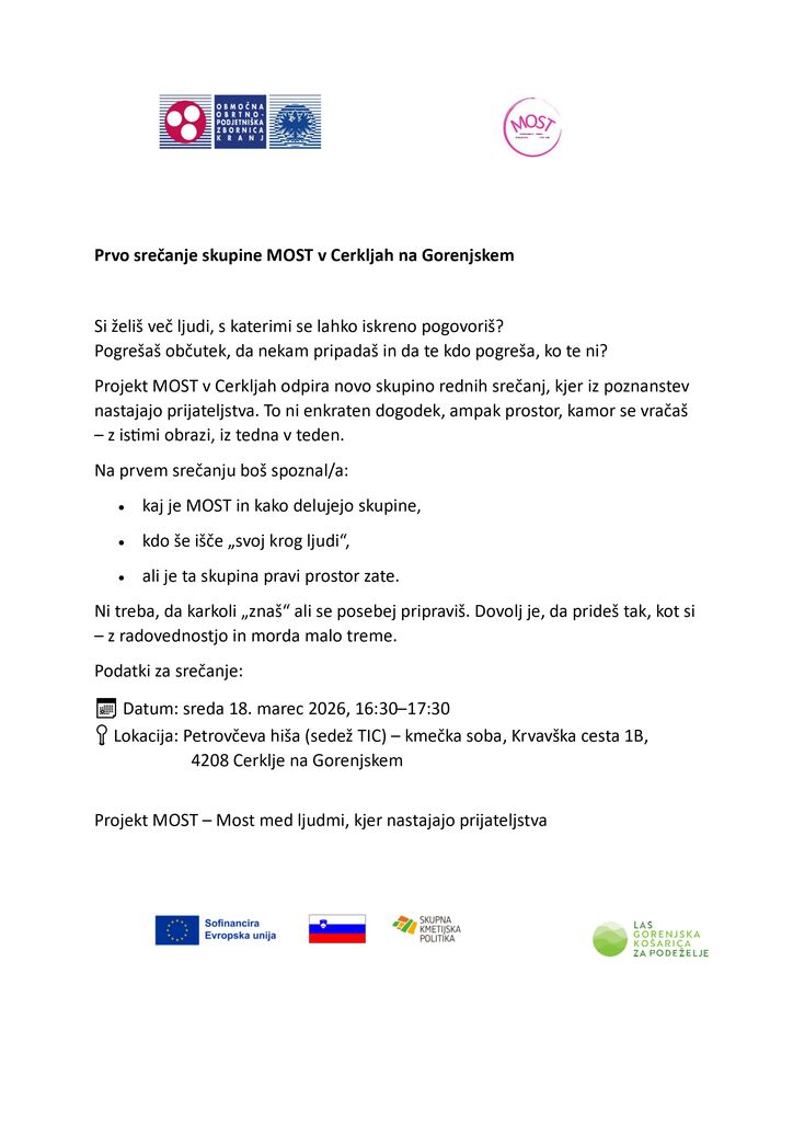 Na prvem srečanju boste spoznali, kaj je projekt MOST in kako delujejo skupine, srečali ljudi, ki prav tako iščejo svoj krog druženja, ter ugotovili, ali je ta skupina pravi prostor za vas. Za udeležbo ni potrebna posebna priprava – dovolj je, da pridete takšni, kot ste.