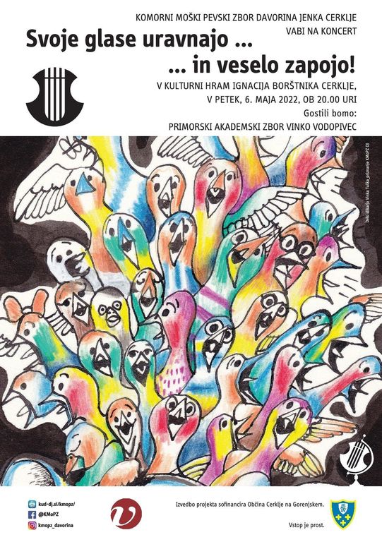 Pevci Komornega moškega pevskega zbora Davorina Jenka Cerklje ter Primorskega akademskega pevskega zbora Vinko Vodopivec bodo v petek, 6. maja 2022, s pričetkom ob 20. uri, v Kulturnem hramu Ignacija Borštnika v Cerkljah, pripravili skupni koncert, ki so ga poimenovali "SVOJE GLASE URAVNAJO... IN VESELO ZAPOJO!"
