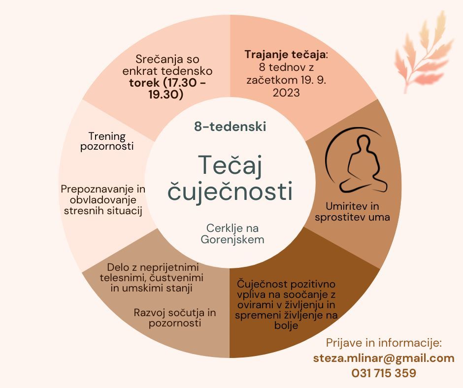 V torek 19. septembra 2023 ob 17.30 uri v Cerkljah na Gorenjskem se začne 8-tedenski tečaj na čuječnosti utemeljenega zmanjševanja stresa (Mindfulness-Based Stress Reduction ali MBSR).
