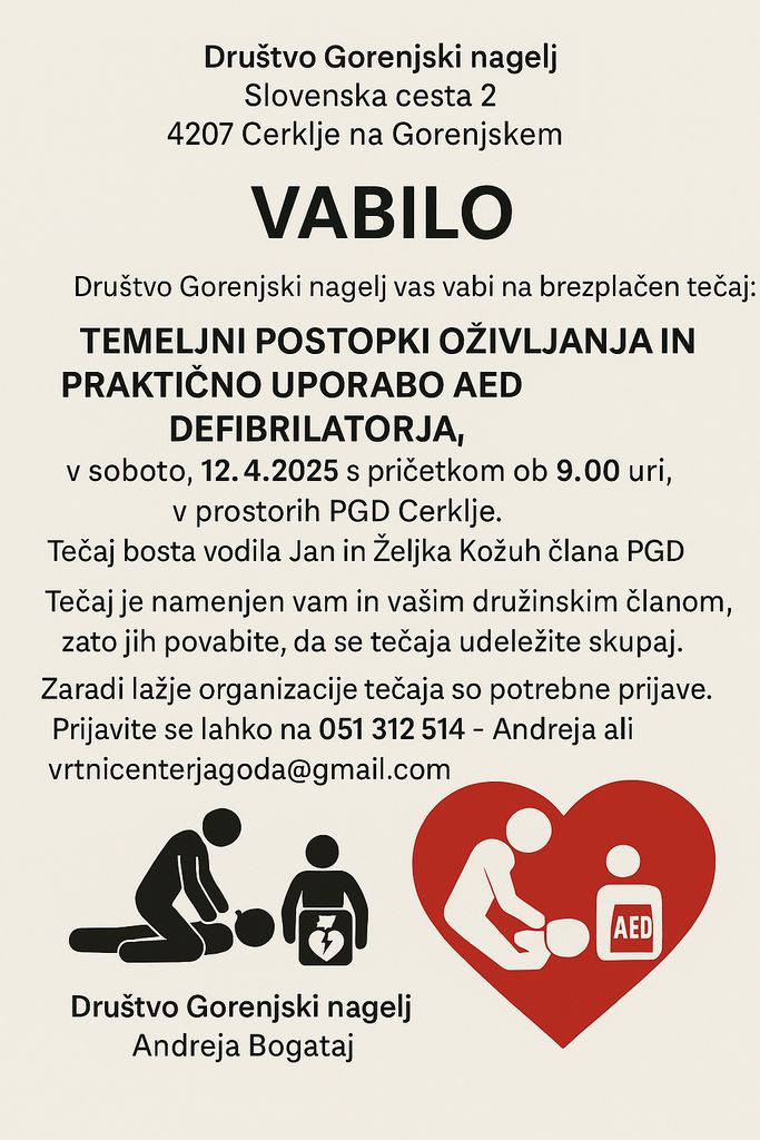 AED DEFIBRILATORJA, v soboto 12.4.2025 s pričetkom ob 9.00