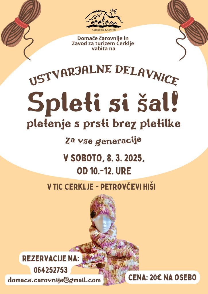 Bi radi ustvarili nekaj unikatnega in uporabnega? Pridružite se nam na delavnici pletenja s prsti in si izdelajte topel šal ali celo kapo! Ustvarjalno, sproščujoče in zabavno – delavnica je primerna za otroke od 7. leta naprej in za vse generacije, ki radi ustvarjajo z rokami.