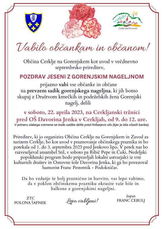 Organizator: Občina Cerklje na Gorenjskem in Zavod za turizem Cerklje, Polona Šafner, 04 28 15 822