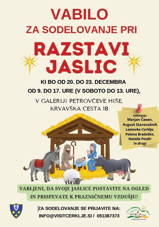 Vabimo vas, da sodelujete pri razstavi jaslic, ki bo potekala v Galeriji Petrovčeve hiše, od 20. do 23. decembra, med 9. in 17. uro (v soboto do 13. ure).