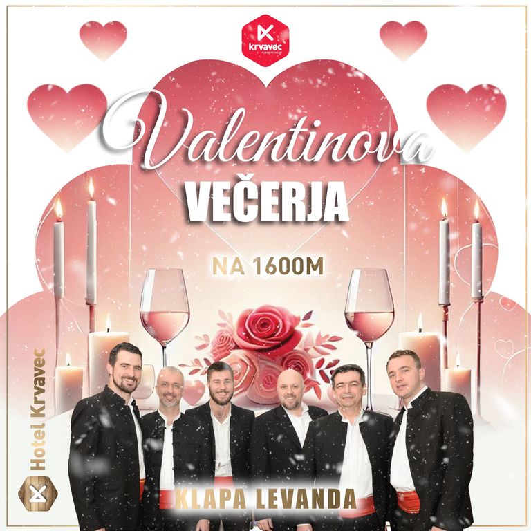 Naj bo vajin večer nekaj posebnega, v Hotelu Krvavec. Razvajali vaju bomo z 5-hodnim menijem izpod rok kulinaričnega mojstra Paula Šverka in dalmatinskimi melodijami Klape Levanda.