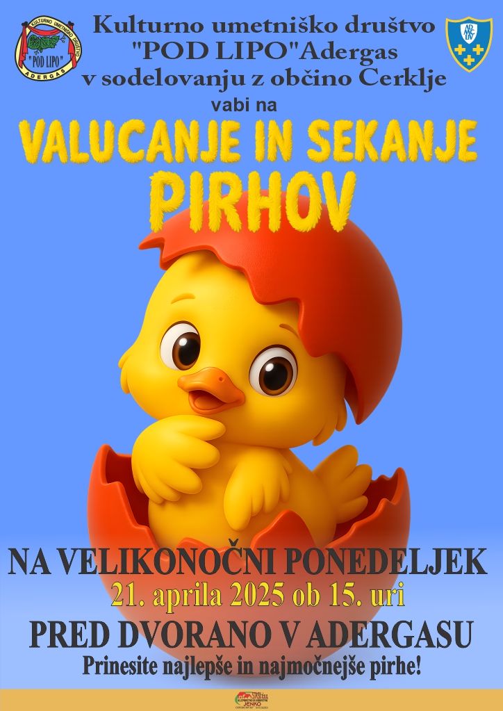 Vabljeni na tradicionalno valucanje in sekanje pirhov, tako kot je bilo to včasih. S seboj prinesite pirhe in dobro voljo, za ostalo bo poskrbljeno. Še posebej vabljeni otroci!