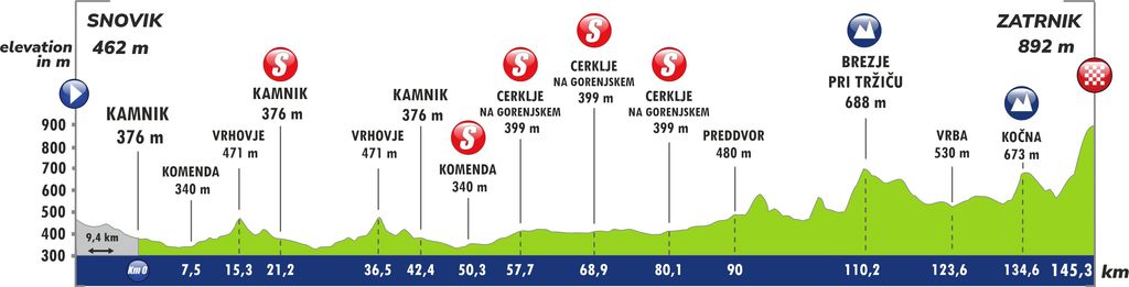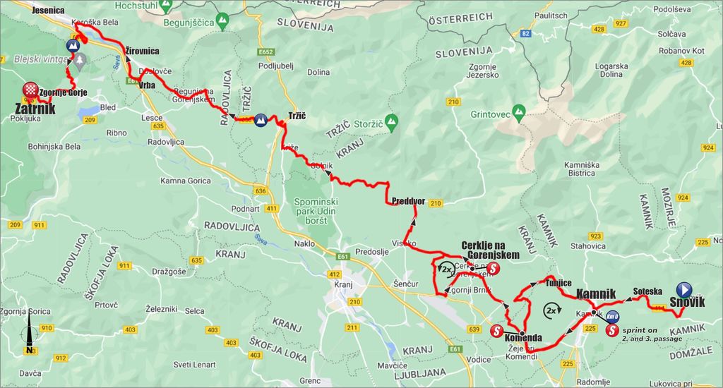 Start dirke je v Termah Snovik, sledijo krogi v Kamniku, leteči cilj v Komendi, transfer do krogov v Cerkljah na Gorenjskem. Nato pa preko občin Preddvor, Tržič, Žirovnica (Vrba), Jesenice, mimo Soteske Vintgar do cilja na smučišču Zatrnik. Skupna dolžina dirke je 145,3 km.