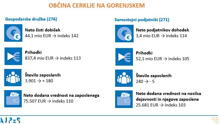 Za leto 2024 je AJPES predložilo podatke iz letnih poročil na poenotenih obrazcih za državno statistiko tudi 276 gospodarskih družb in 271 samostojnih podjetnikov s sedežem v občini Cerklje na Gorenjskem.