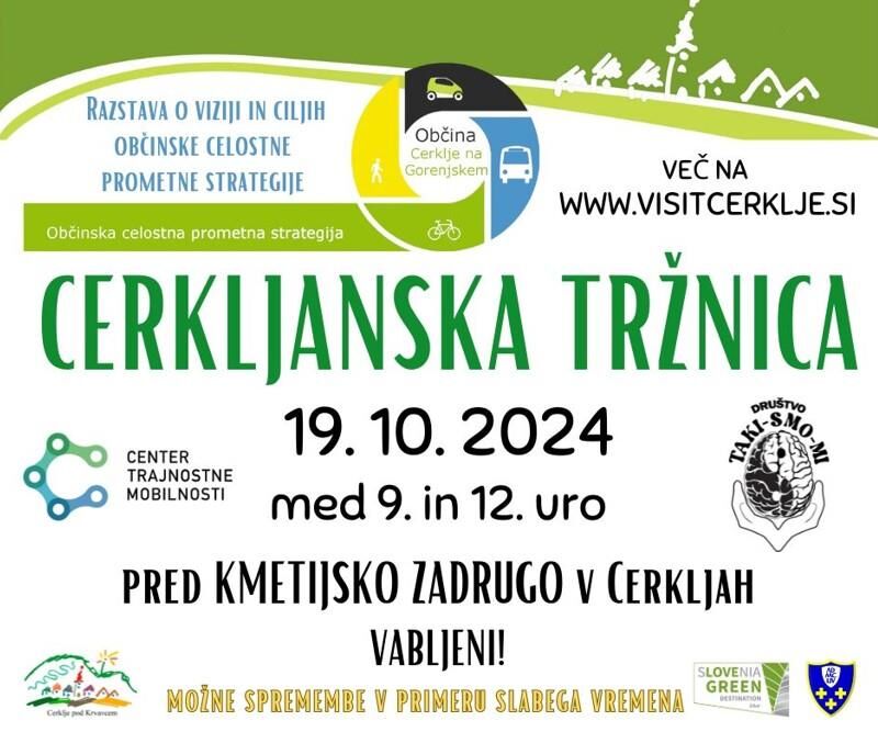 Z veseljem vas vabimo na oktobrsko Cerkljansko tržnico, kjer boste lahko podprli lokalne ponudnike in kupili sveže pridelke ter unikatne izdelke. Tržnica bo potekala 19. oktobra 2024 med 9. in 12. uro pred Kmetijsko zadrugo Cerklje, kjer vas bodo pričakale številne stojnice z raznolikimi izdelki.