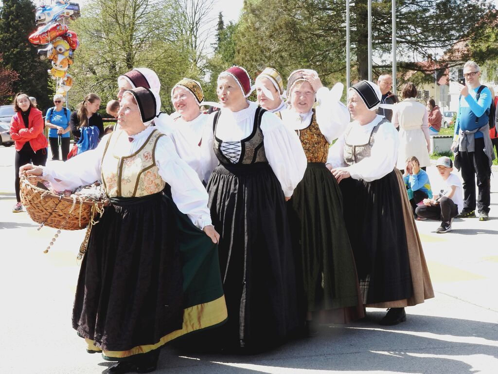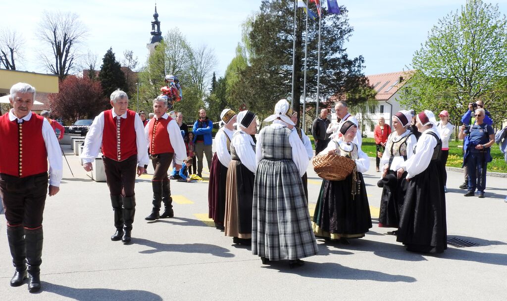 Člani Folklorne skupine iz Cerkelj so zaigrali in zaplesali  venček plesov z naslovom  Na cerkljanski tržnici