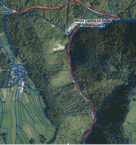 Grafični prikaz območja popolne zapore občinske ceste Grad – Štefanja Gora (LC326091) – označeno z rdečo barvo: