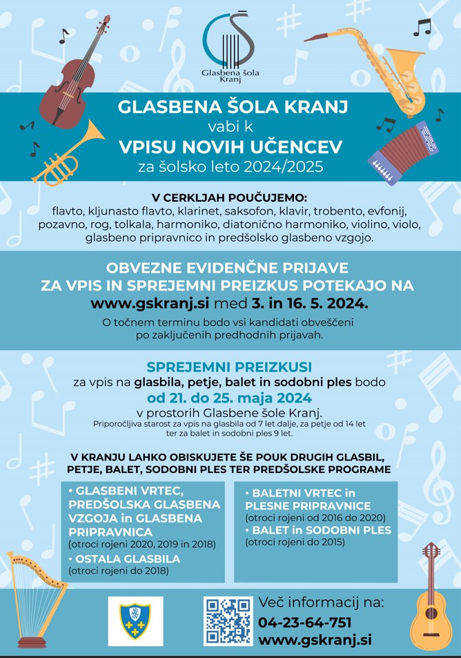 Glasbena šola Kranj vabi k vpisu novih učencev za šolsko leto 2024/2025.