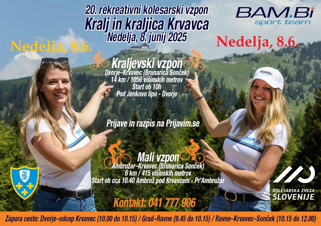 ŠD BAM.Bi vas obvešča, da bo v nedeljo, 8. junija 2025 na sporedu tradicionalni 20. rekreativni kolesarski vzpon na Krvavec za Kralja in Kraljico Krvavca, ki šteje tudi za Pokal Slovenije za amaterske kategorije.