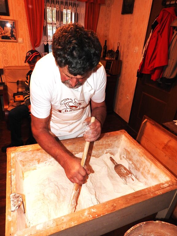 Testo je zamesil v več kot 120 let stari mentrgi, tako da je bilo zanimivo opazovati postopek, ko so prešce nastajale po starem, bi lahko rekli. Tokrat je za peko prešc uporabil belo in delno tudi črno moko, ljudje pa so uporabljali tudi koruzno in ajdovo moko. Pri pripravi moke, ki jo je bilo potrebno presejati, je sodelovala tudi Nadja Žura.