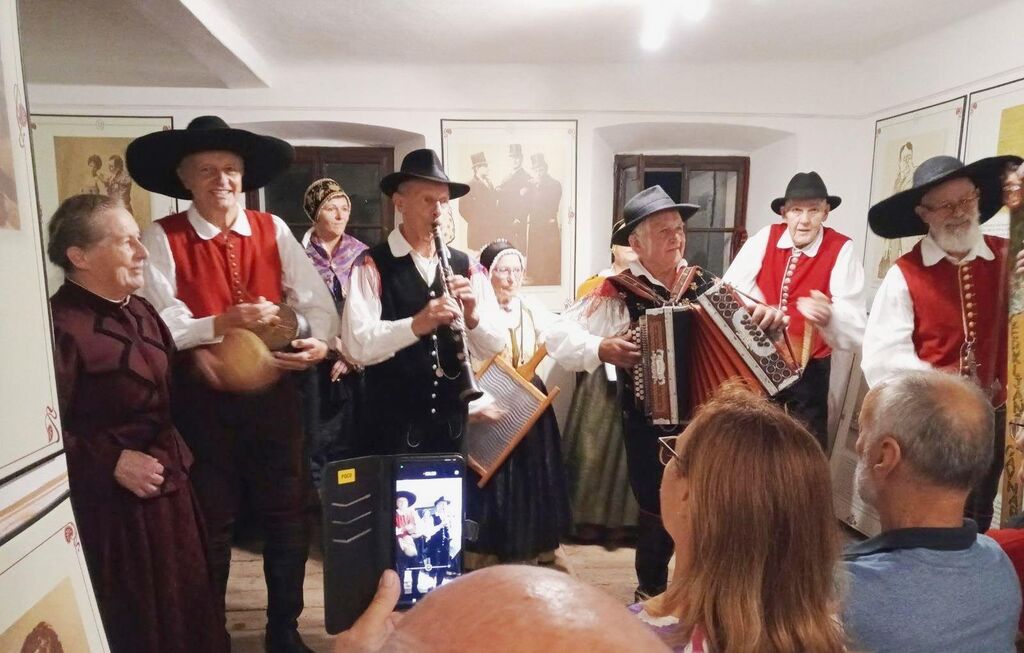 Nato je vreme ponagajalo in začelo je deževati, zato so prireditev nadaljevali v notranjih prostorih Borštnikove hiše. Z igranjem na citre je navdušila Špela Štular iz Zaloga. Kot pravi s tem milozvočnim instrumentom popestri poroke, okrogle obletnice in kulturne prireditve. Zaigrala je pesmi Mrzel veter tebe žene in Kje so tiste stezice. Ljudska pevca, zakonca Jožica in Jože iz Trboj, ki delujeta v KD Folklora Cerklje sta zaigrala na svež bršljanov list ob spremljavi diatonične harmonike Rožič ne bom trgala, Jesenski večeri in Venček narodnih. Pevska skupina ljudskega petja Klasje deluje enajsto leto. Veliko nastopajo tudi v domovih za starejše, njih namen pa je ohranjati našo kulturno dediščino in s tem našo edinstvenost. Zapeli so Moj očka in moja mamca in Nekdo gre po cesti. Nastopili pa so tudi Cerkljanski gavnarji, ki delujejo v sklopu KD Folklora Cerklje. Ljubiteljski godci igrajo poleg na prave instrumente tudi na inštrumente lastne izdelave. Zaigrali so štiri skladbe, med njimi Rom pom pom.