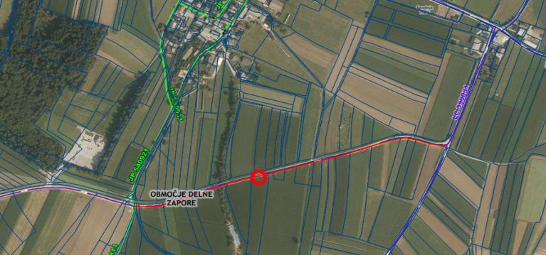 Grafični prikaz območja delne zapore občinske ceste LC 039031 (označeno z rdečo barvo):