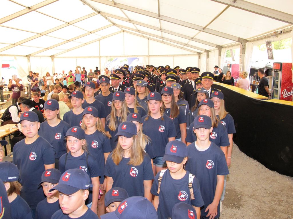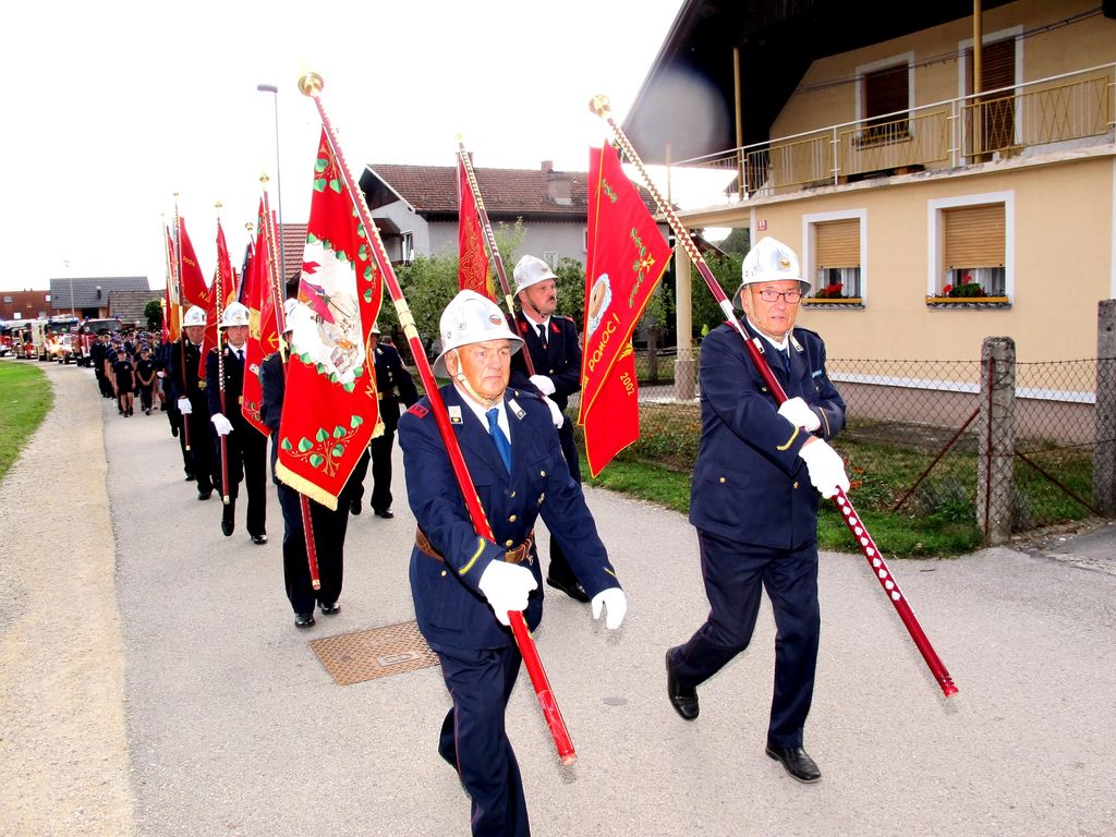 V svečani paradi z Godbo Cerklje na čelu, je do prireditvenega prostora izpred osnovne šole prikorakalo za 13 praporščaki skoraj sto uniformiranih gasilcev, tudi iz okoliških društev.