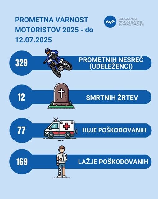 - Do 12.7. je na slovenskih cestah umrlo že 12 motoristov in 2 mopedista – več kot v enakem obdobju zadnjih dveh let skupaj.