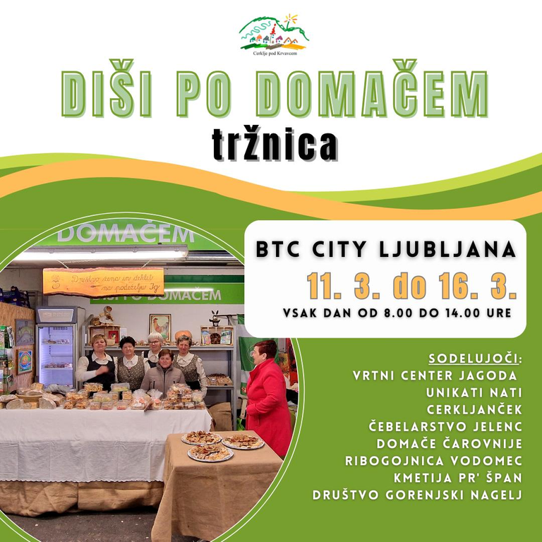 Lepo vabljeni, da nas obiščete na tržnici "DIŠI PO DOMAČEM" v BTC CITY Ljubljana, od 11. do 16. marca 2024, vsak dan od 8.00 do 14.00 ure.
