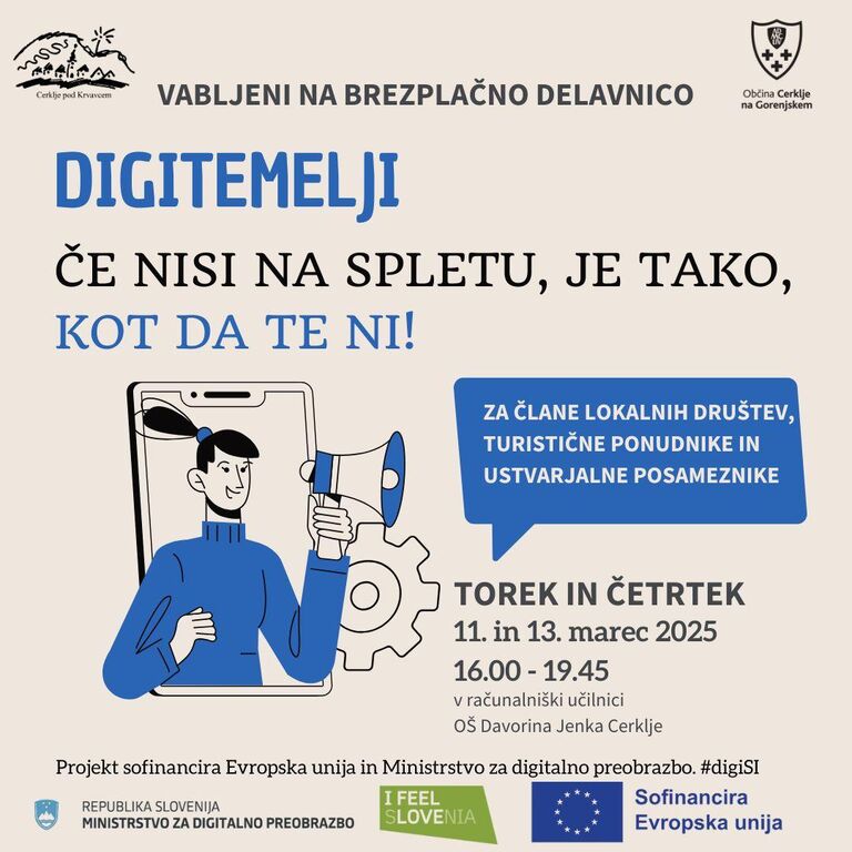 Zavod za turizem Cerklje vabi turistične ponudnike in predstavnike lokalnih društev na brezplačno delavnico digitalnih veščin DigiTemelji. Namen delavnice je izboljšati digitalne kompetence odraslih in omogočiti učinkovito uporabo sodobnih tehnologij, ki so danes ključnega pomena za uspešno poslovanje in delovanje v skupnosti.
