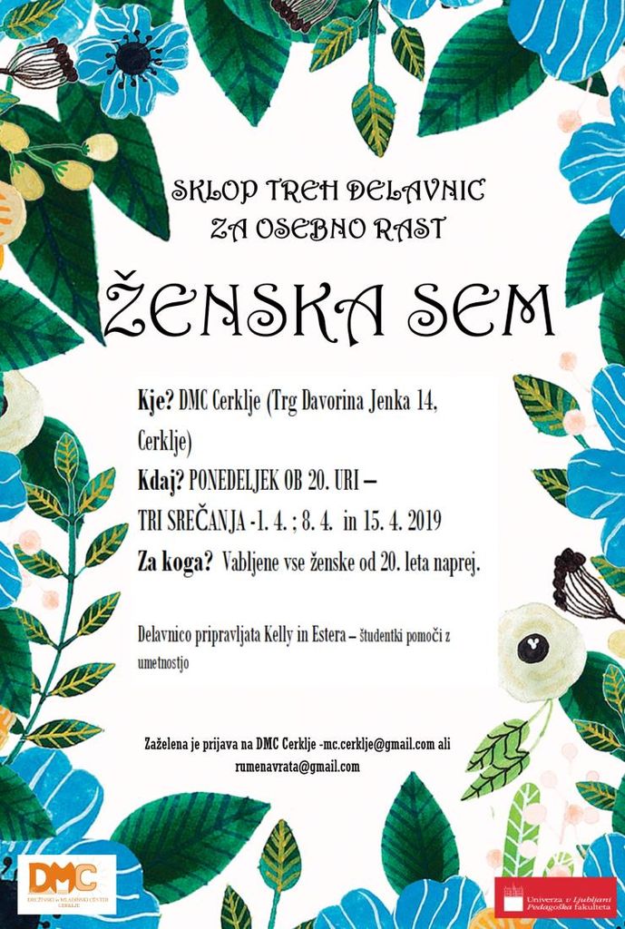 Družinski in mladinski center Cerklje vabi na Sklop treh delavnic za osebno rast z naslovom Ženska sem. Delavnice bodo potekale v ponedeljek, 1. aprila, 8. aprila in 15. aprila 2019 ob 20. uri v prostorih Družinskega in mladinskega centra Cerklje. Vabljene vse ženske od 20. leta starosti naprej.